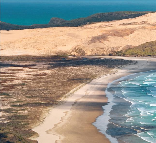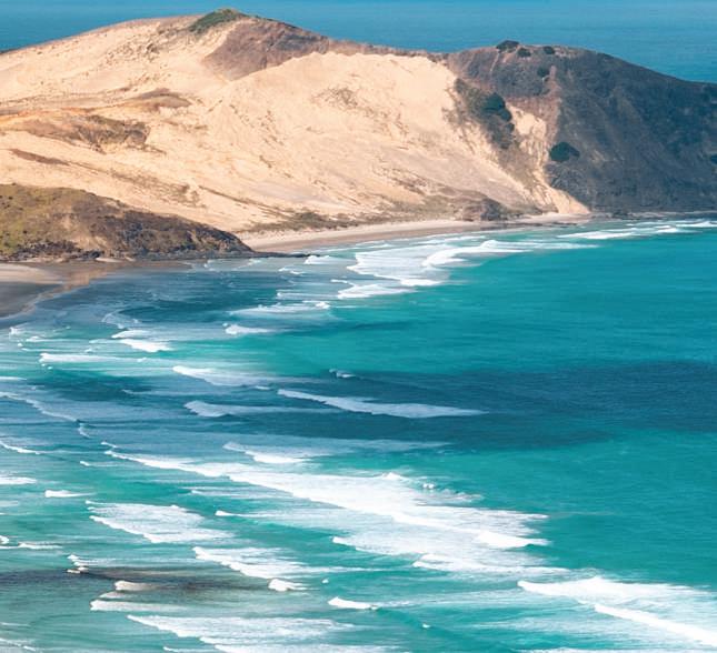 To the west, the endless expanse of sand at Ahipara draws surfers and fishers year-round