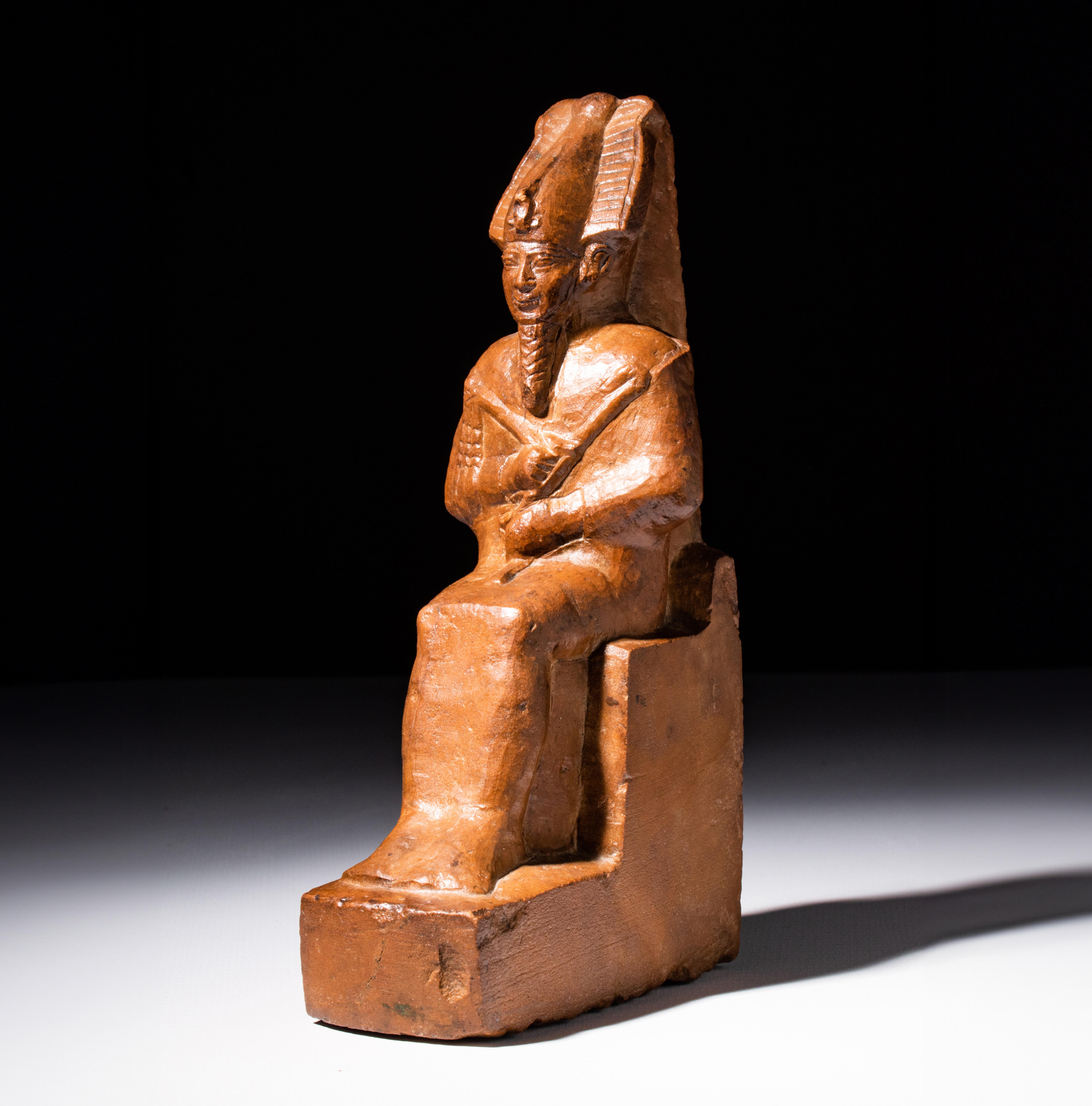 An Ancient Egyptian stone statuette depicting the god Osiris, shown seated in mummiform with a braided divine beard, an atef-crown, and a peaceful, idealised face. He is posed with the arms folded across the chest holding a crook and flail. Osiris is the most significant and important god in the Egyptian pantheon. He was known firstly as a god of fertility, then as a god of the underworld. In his role of Lord of the Underworld, he was associated with the pharaohs and is, thus, generally portrayed as a deceased pharaoh, as seen on this figure. This very important example was exhibited at Kresge Art Gallery, Michigan State University, 1985 to 2002. Published: J. Eisenberg, Art of the Ancient World, vol XXII (2011), no.158. Size: 145mm x 75mm; Weight: 580g.