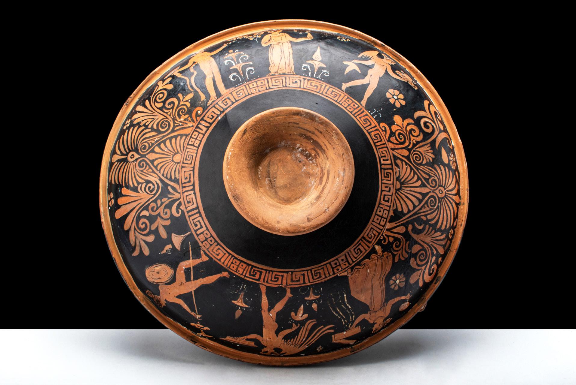 The scene can probably be interpreted as a soldier leaving for war. The warrior begins his journey without his shield (on the right of the woman), indicating that he will not return, while his wife brings him funeral offerings to indicate his fate. The scene takes place in a garden designed in a very naturalistic manner. The outer side of the vessel is adorned with red-figure scenes of offerers and winged erotes bearing gifts, alternating with highly articulated palmette motifs. Size: 445mm x 430mm; Weight: 2.61kg.