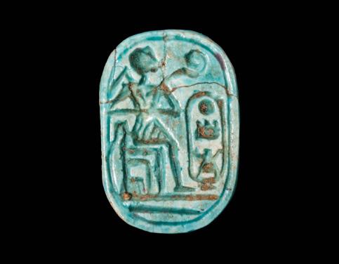 A bright blue faience shabti of Psamtik, God’s Father, born to Seba-rekhyet. He is standing on a trapezoidal base and holds the pick, hoe and seed-sack. He has a beard with a curled tip and a striated tripartite wig that falls to the top of the back-pillar. The body has nine lines of inscription. This piece is accompanied by a custom-made stand. Cf. G. James, Shabtis. A Private View, Paris, 2002, no. 90; the author notes the very fine workmanship of ushabtis of Psamtik, as well as their bright blue glaze, which is exceptional for this period. Also see M. Paige-Gasser and A.B. Wiese, Égypte. Moments d’éternité, Geneva, 1997, no. 161A. Reviewed by Simone Musso, consultant curator for Egyptian antiquities at the Stibbert Museum, Florence, Italy, member of the Nuri Archaeological Expedition.