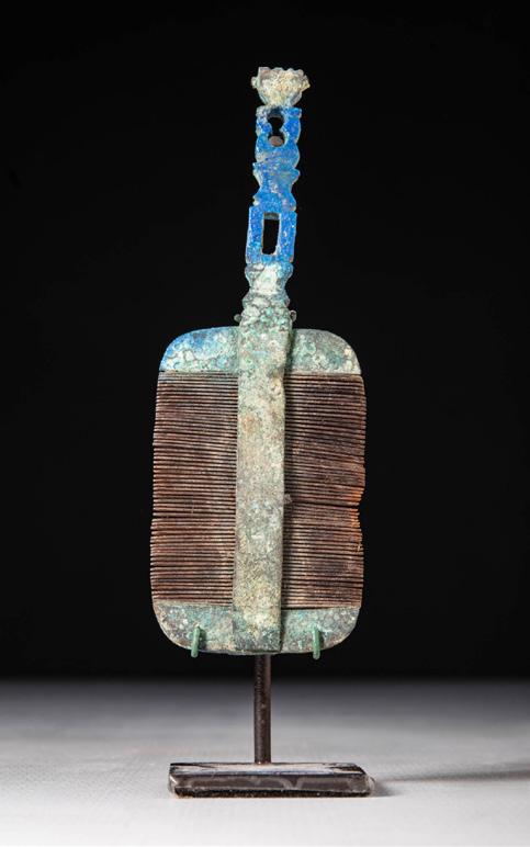 A double iron and bronze comb. The openwork handle is made in lapis lazuli. This piece is accompanied by a modern custom-made stand.