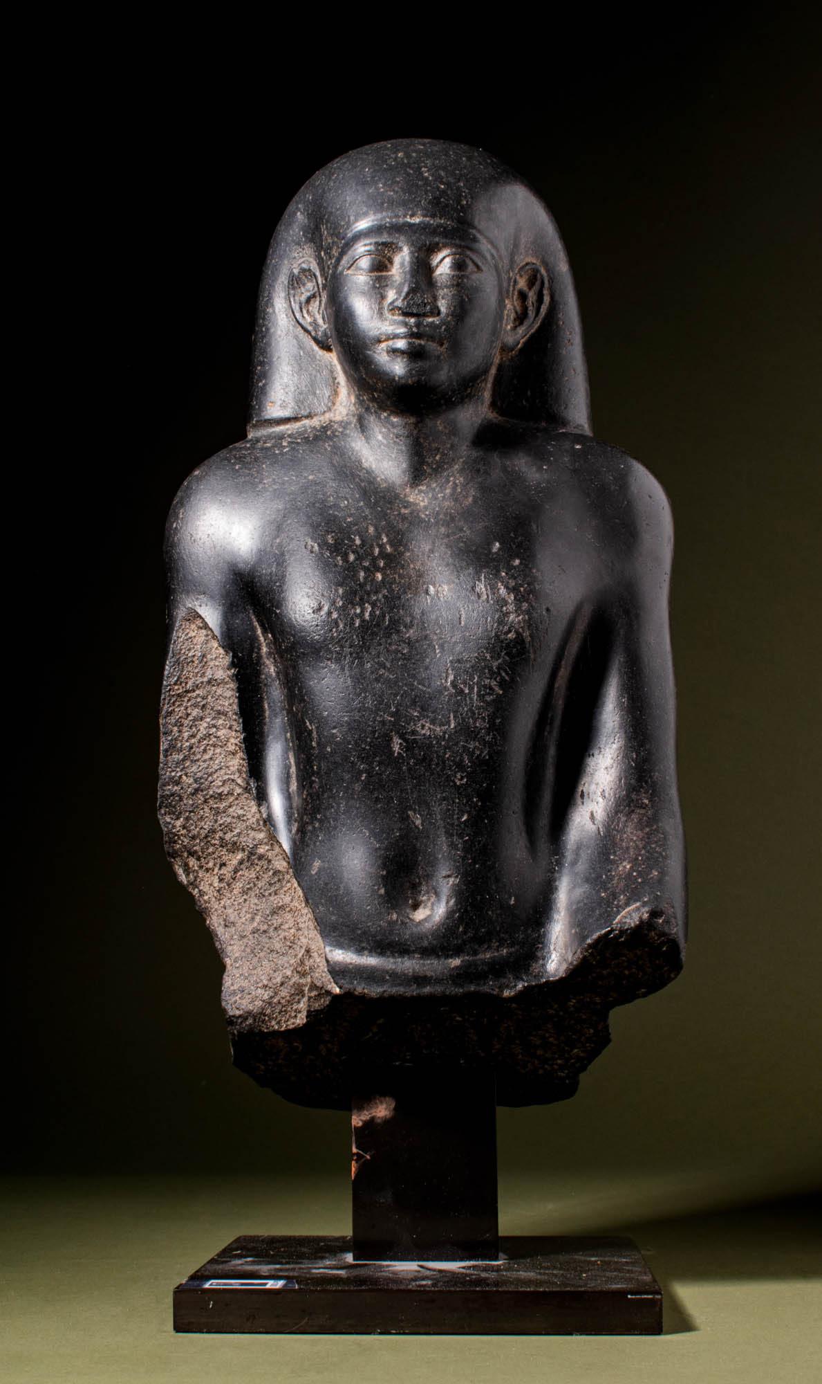 An exceptional and very well-preserved basalt statue in the name of the priest Pa-khar-Khonsu. It represents the priest in a kneeling position. His hands are resting on his thighs, his torso is bare and he is wearing a loincloth with a belt. His head has a round face and is topped with a straight wig revealing the ears. At the back, the dorsal pillar is engraved with two hieroglyphic columns: “Saite formula” concerning Pa-khar-Khonsu who combined various priestly functions including the prophet of Amun in Ipet-sout, and prophet of Thebes, the Victorious, holder of power. This piece is accompanied by a high-quality modern custom-made stand. A statue bearing the same name is kept at the Oriental Museum in San José (California), Inv. 1583. Bibliography: BV Bothmer, “Egyptian sculpture of the Late Period”, Brooklyn, 1960, pp. 130-131, n°102, pl. 95, fig. 255-256.