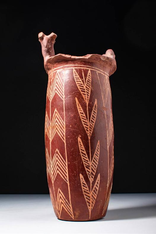 An exceptionally rare tubular ceramic vessel with a flat base, rounded walls and a tapered lower section. The everted rim is adorned with two simplified animal forms. The surface has alternating white-painted vertical panels featuring chevron patterns and stylised vegetal motifs. Possibly the best-preserved example ever offered on the market! Exhibited at Antikenmuseum Basel from Sep. 2004 until 2014. For similar see: The Museum of Fine Arts, Boston, Accession Number 04.1814; The Louvre Museum, Main number: E 28029. Exhibited at Antikenmuseum Basel from Sep. 2004 until 2014.