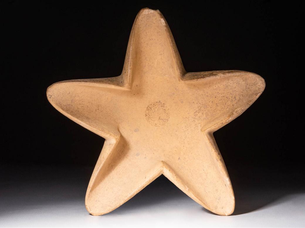 A carved from limestone, a high-relief stela featuring a prominent abstract face with a slender triangular nose, deep-set ovoid eyes beneath thin brows, a broad forehead, rounded cheekbones, a tapered mandible, and a petite, expressionless mouth. Russet-red pigment colours the face as well as the lateral plaque sides and the chalky white material within the eyes suggest they were once inlaid with attractive fragments of colourful stones. Shallow grooves on the verso indicate how the plaque would have been suspended, perhaps on a slanted surface. For similar see: Sotheby’s, Ancient Sculpture and Works of Art, Part I, 7 December 2021, Lot 1.