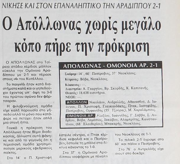 ΑΠΟΛΛΩΝ (Ερνάν Λοσάδα): Κουν, Γκασπάρ (72’ Ζμρχάλ), Λαμ (46’ Βούρος), Κβίντα, Μαλεκκίδης (72’ Σιήκκης), Λιούμπιτς, Σπόλιαριτς (82’ Βρίκκης), Βάισμπεκ, Τόμας, Ντουοντού, Ροντρίγκες (18’ Γιούσεφ). Σκόρερ: - / Τόμας 34’ (πεν.)