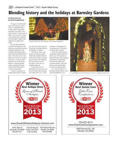 Blending history and the holidays at Barnsley Gardens story & photos By KATIE VanBRACKLE The ruins of Godfrey Barnsley’s 19th-century country manor in Adairsville offer a holiday open house experience like none other. In this case, the term “open house” is literal. Look up and you’ll see only twinkling stars overhead and the edges of green vines creeping over aging brick walls. And yet dancing flames crackle in the fireplaces, candles glow amid freshly scented evergreen garlands on the mantels and beautifully decorated Christmas trees stand in each of the main rooms. Just steps from the manor house’s front door, a boxwood path planted over 160 years ago leads to a parterre garden where a sparkling fountain trickles amid thousands of colorful holiday lights. Though it may seem an unlikely pairing, the combina-