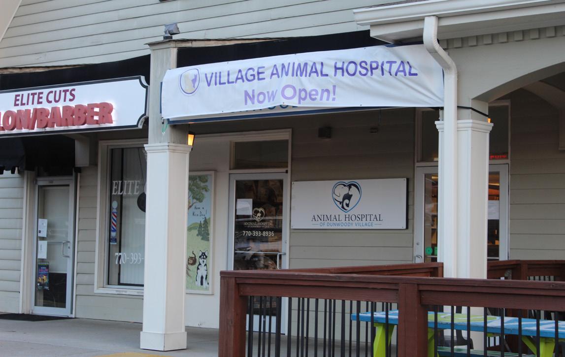 Village Animal Hospital’s banner covers an old sign from when the space was corporately owned. The vet clinic is in Dunwoody Plaza off Dunwoody Village Parkway.