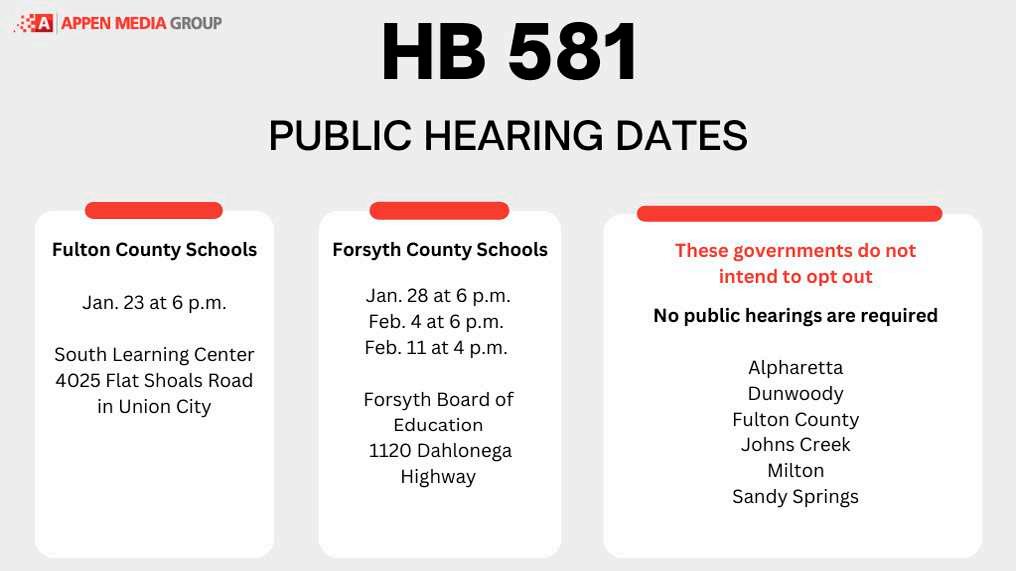 • Forsyth County Schools intends to opt out of HB 581 and will hold hearings on Jan. 28 at 6 p.m., Feb. 4 at 6 p.m. and Feb. 11 at 4 p.m. at 1120 Dahlonega Highway in Cumming.