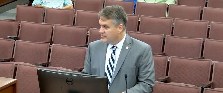 Forsyth County Schools Deputy Superintendent Mitch Young presents plans for redistricting in the 2024-25 school year Aug. 8 at a Board of Education work session. The redistricting would likely affect eight county elementary schools.