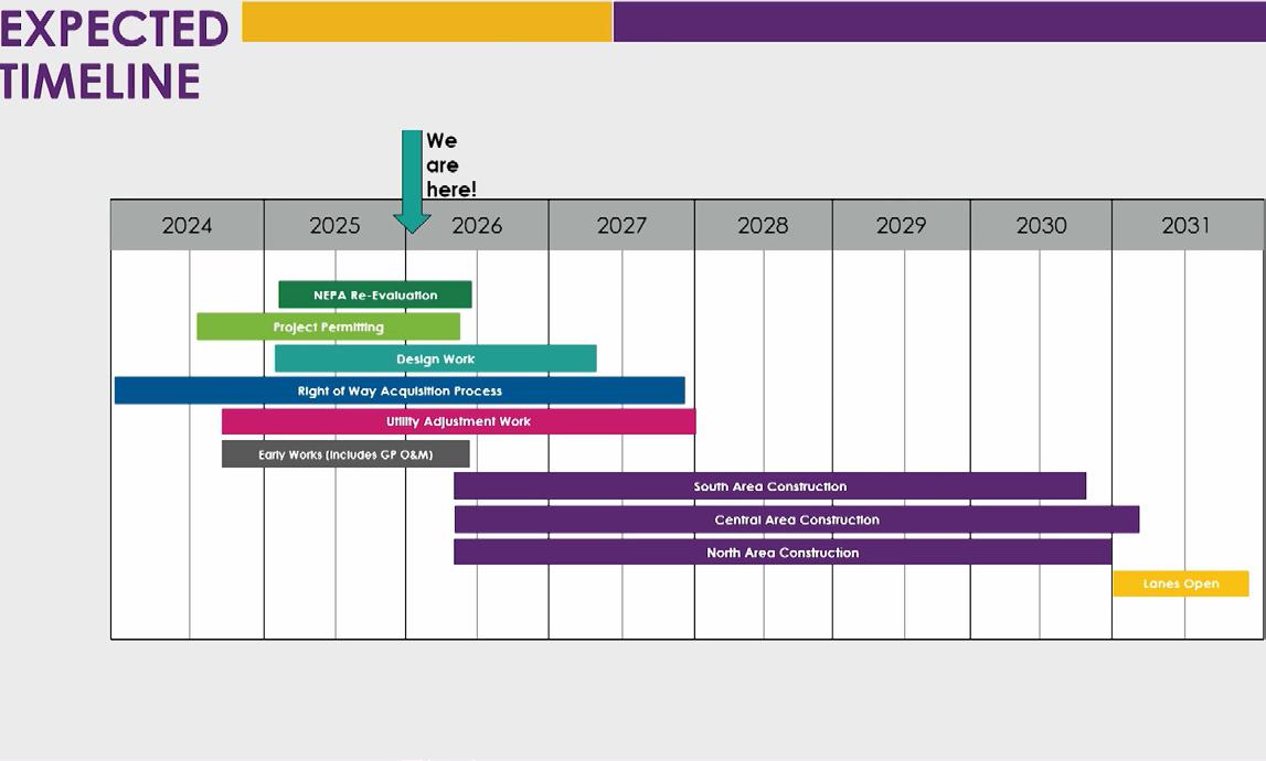 A timeline shows the rollout for the Ga. 400 express lane project along its 16-mile route from Sandy Springs into south Forsyth County. Completion is slated for 2031.