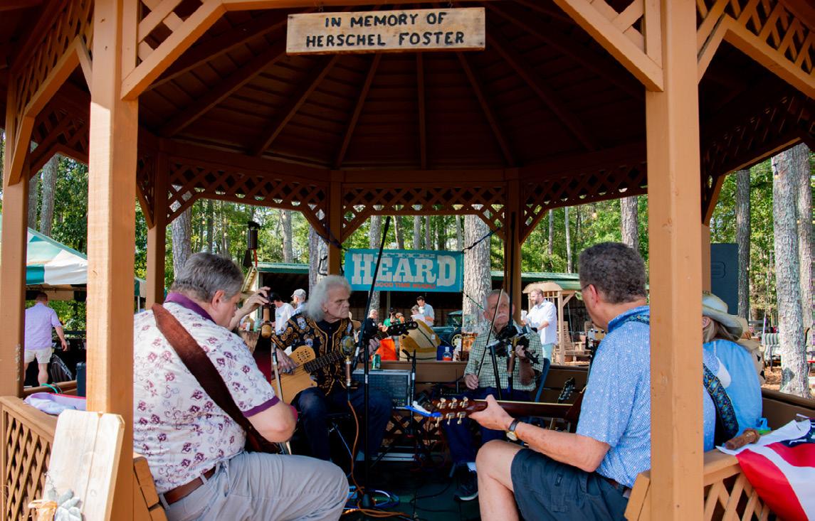 The Heard performs bluegrass music from the gazebo during the Milton Historical Society’s annual Shindig, filling the farm with fiddle, banjo, and guitar.
