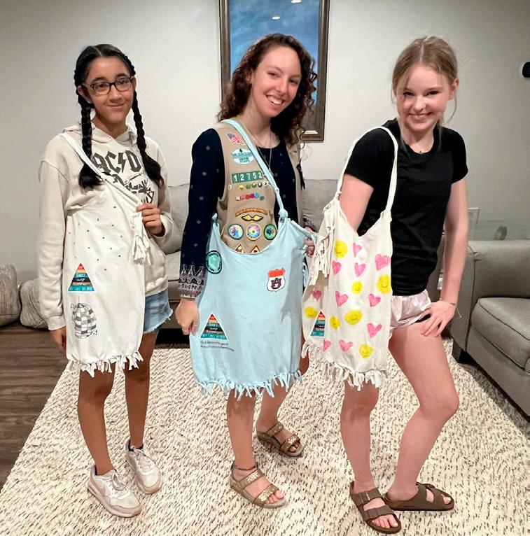 GIRL SCOUTS OF GREATER ATLANTA/PROVIDED Johns Creek Girl Scout Natalie George, center, stands with workshop participants Krithika Moorthy, left, and Lucy Snaith, who learned how to turn their favorite old T-shirts into reusable tote bags as part of George’s Gold Award project. George was awarded a $10,000 scholarship from the Girl Scouts of the USA and an $8,000 scholarship from the Girl Scouts of Greater Atlanta for her project that addressed the hidden human and environmental costs of fast fashion.