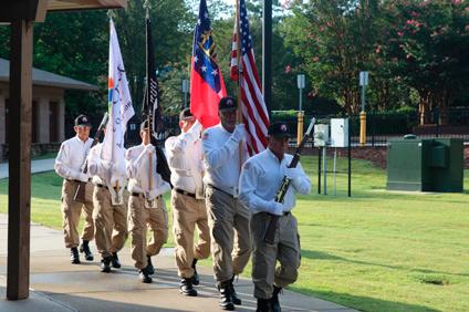 At top: Kenneth Marchello, who served in the New York Police Department, describes his experience at ground zero during the 9/11 attacks at the Patriot Day program held at Newtown Park Sept. 11. Award-winning journalist Donna Lowry, at left, interviewed Marchello about his experience. Above: The Johns Creek Veterans Association Color Guard marches to the stage to post the colors.