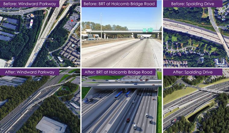 A before-and-after of three sections of the Ga. 400 express lanes project shows a reconfigured exit at Windward Parkway in Alpharetta, bus rapid transit passing underneath Holcomb Bridge Road and the southern end of the project at Spalding Drive. The Georgia Department of Transportation said heavy construction on the express lanes project is set to begin in July 2026.