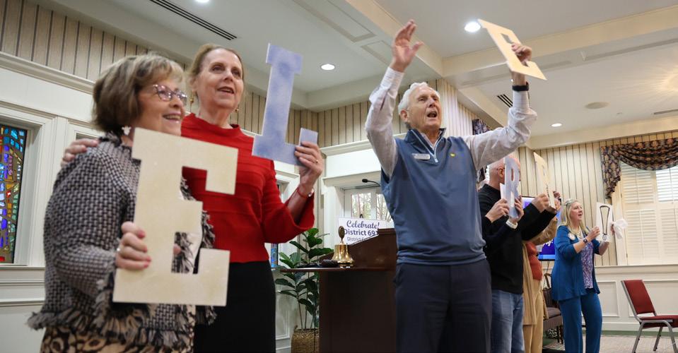 Johns Creek Rotary members dance with signs spelling “celebrate” during an Oct. 27 meeting marking its 25th birthday.