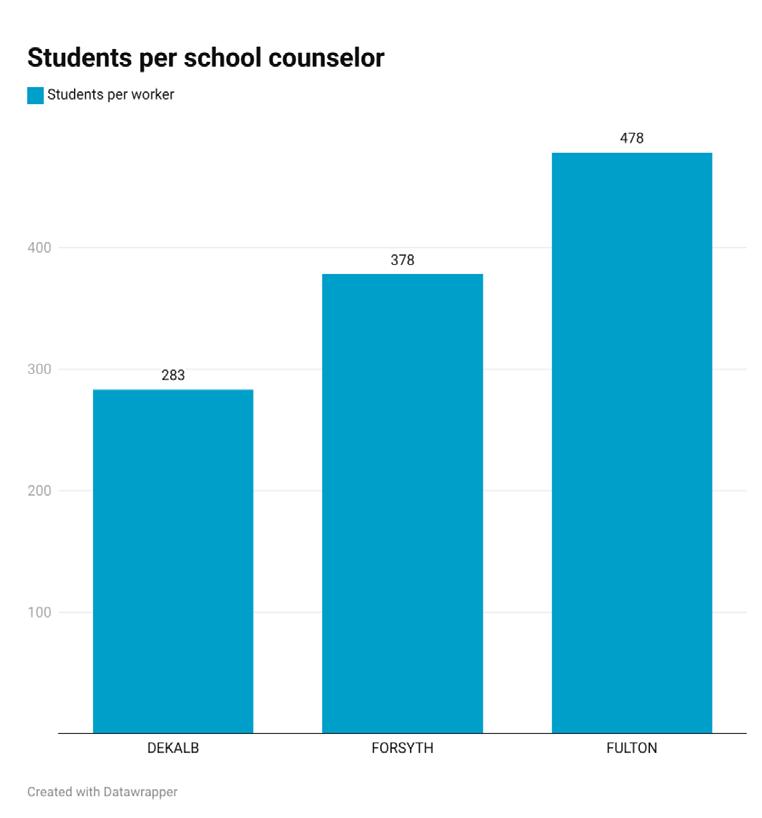 JACOB TOMBERLIN/PROVIDED A comparison of the number of students per school counselor across Dekalb, Forsyth and Fulton county school districts shows that Forsyth County Schools is mid-range with 378 students per counselor across its elementary, middle and high schools.