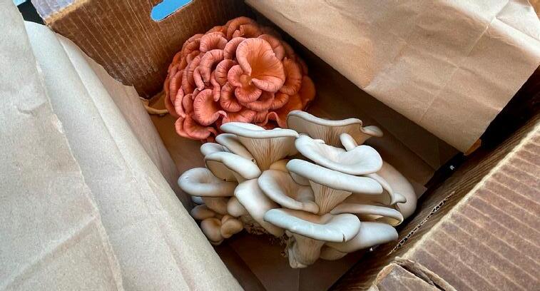 Williams fetched a box of mushrooms from his car — pink and blue oysters, which he identified by their Latin names.