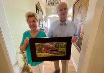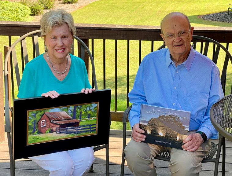 Dianne Williams holds her painting of a barn originally photographed by Robert Meyers, who is holding his book “Barns of Old Milton County,” at his home on Aug. 20.