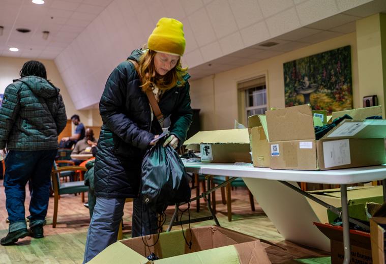 Fulton County Point-In-Time survey volunteer Kathleen Cherry picks up a toiletry kit at the Roswell Senior Center Friday, Jan. 23, for distribution to the homeless.