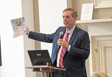 Georgia Secretary of State Brad Raffensperger holds up his grandson’s artwork, titled “A person of integrity is …,” during a Sept. 24 campaign stop at the Rotary Club of Johns Creek-North Fulton’s monthly meeting. Raffensperger spoke to about 50 people at Johns Creek Methodist Church about his work as secretary of state and some of his priorities during his run for governor.
