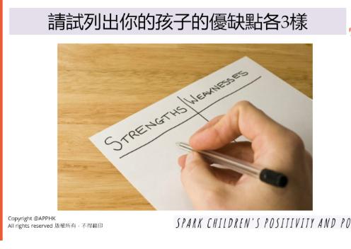 講座旨在介紹以強項為本的正向教養,透過發掘學童的強項和優勢,提 升其⾃我價值感和⾃信⼼,進而促進其全⼈發展。在講座中,講者帶領 家⻑了解⾃⼰和⼦⼥的強項,並透過品格強項的培養,提升學童的全⼈ 發展。此外,講者還講解如何運⽤品格強項去提升親⼦關係,例如透過 有效的溝通和建⽴良好的信任關係,促進家庭和諧與學童的情感連結。 *邀請家⻑列出學童優缺點,學習欣賞學童的強項。