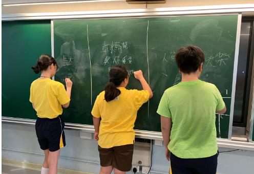 *同學正在利⽤⿊板分組進⾏字詞聯想遊戲,把小組學過的應⽤出來,也能鞏固字詞量。