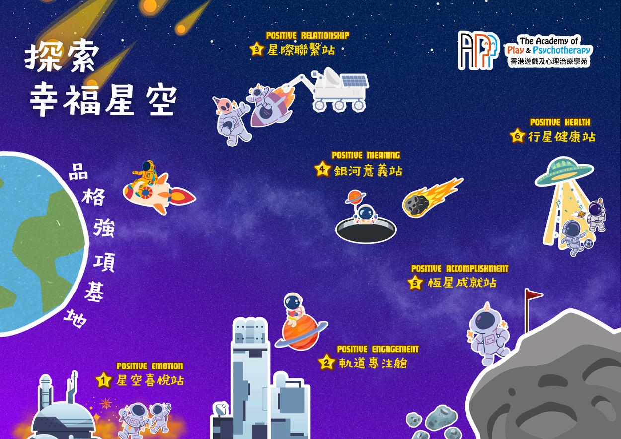 以「龍仔小太空人」 為領航員,透過 PERMA+H 元素, 從品格強項基地出 發,培養幸福感