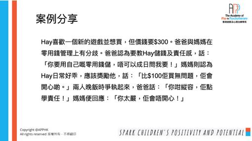 就。除了為親子特別設計的課程外,APPHK 輔導中 心亦為職青與情侶開設各類講座,期望無論身處何種 角色與行業,都能獲得支援,從容應對新一年的各種 挑戰。