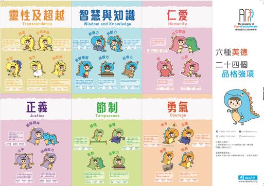 APPHK團隊特地以Dr. Martin Seligman & Christopher Peterson的理論為基礎, 計出代表24個品格強項(Character Strengths)的龍仔,24隻龍仔以6種顏色區分 種美德(Virtue),包括智慧與知識、勇氣、仁愛、正義、節制及靈性與超越。