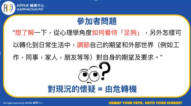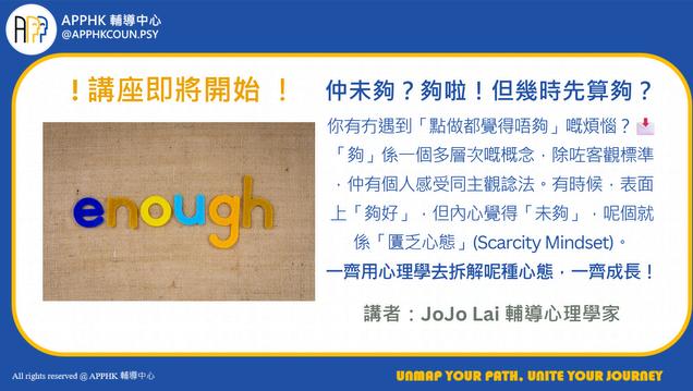 (Enoughness)的多層含義,指出內心「未夠」的感受源於匱乏心態,與童年經驗、社會文化對「無止境進步」 的推崇相關。拆解背後原理,幫助講座參加者區分健康成長與無止境追趕,學習培養足夠感、提升自我關懷,以健 康方式追求目標。