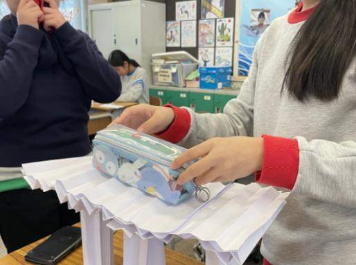 *學童正在製作香包,已在上面寫上鼓勵自己的字句 *學童在折好的紙上放上筆袋,測試承重量