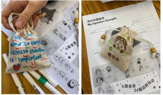 在三小時的工作坊中,四位同事透過不同的互動體驗活動,帶領四班 中學生探索如何進入心流 狀態(Flow),並從認識和培養成長心態 到發掘及運用個人品格強項,提高進入心流的機會。在工作坊中,輔 導員跟學生一起製作了「自我鼓勵香包」,提醒自己在面對挑戰時,可 以運用成長心態和個人強項來應對挑戰和困難,看到學生用心快樂地 製作,很的很感動呢!