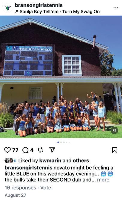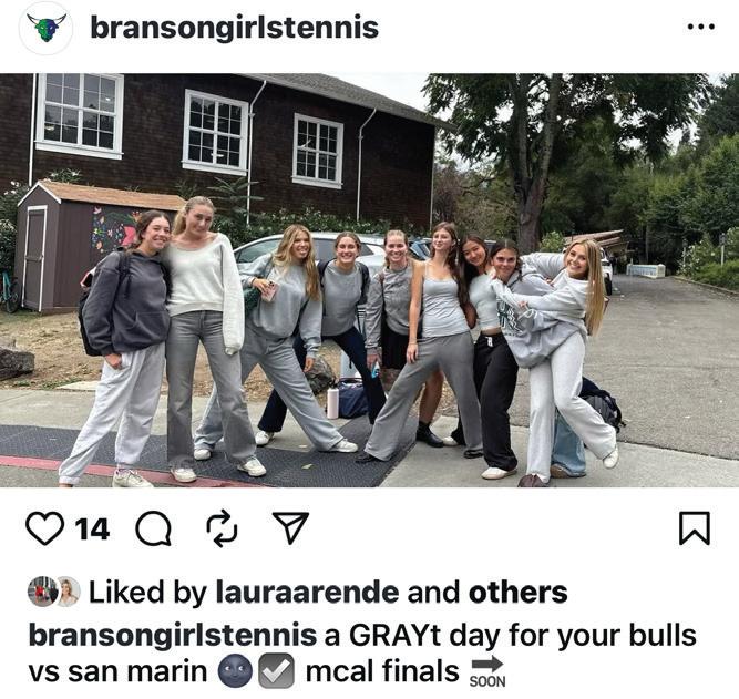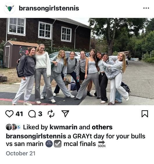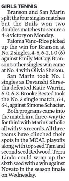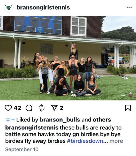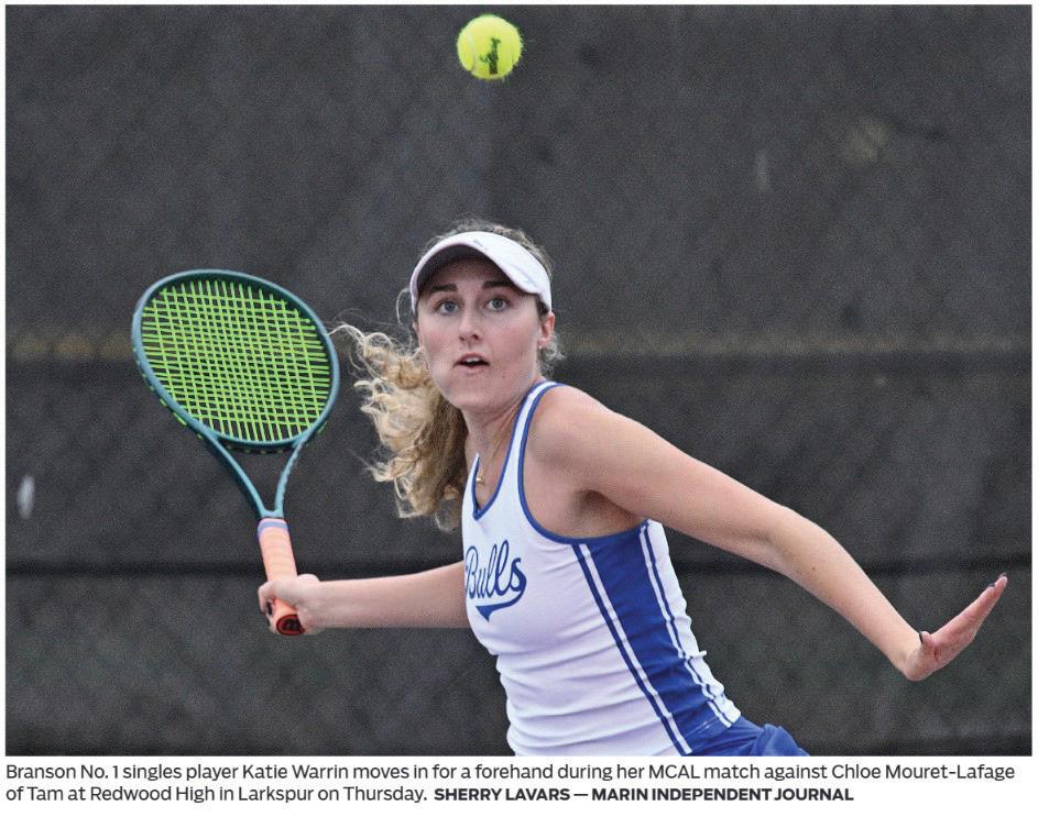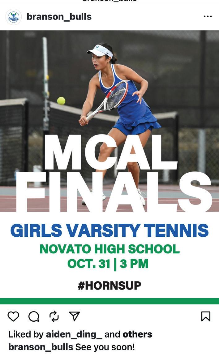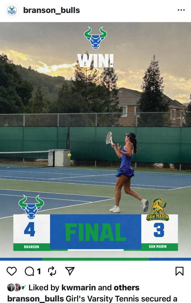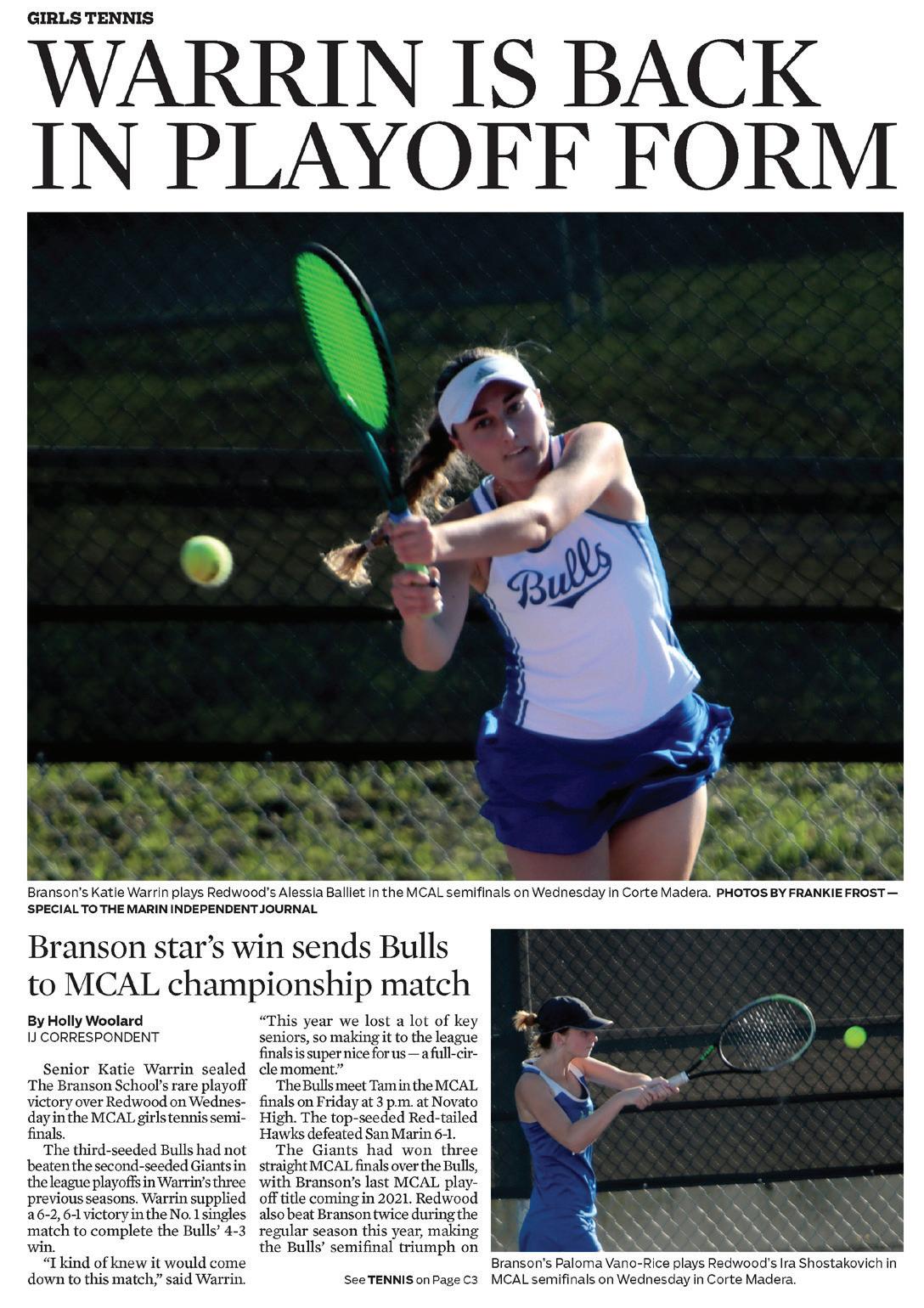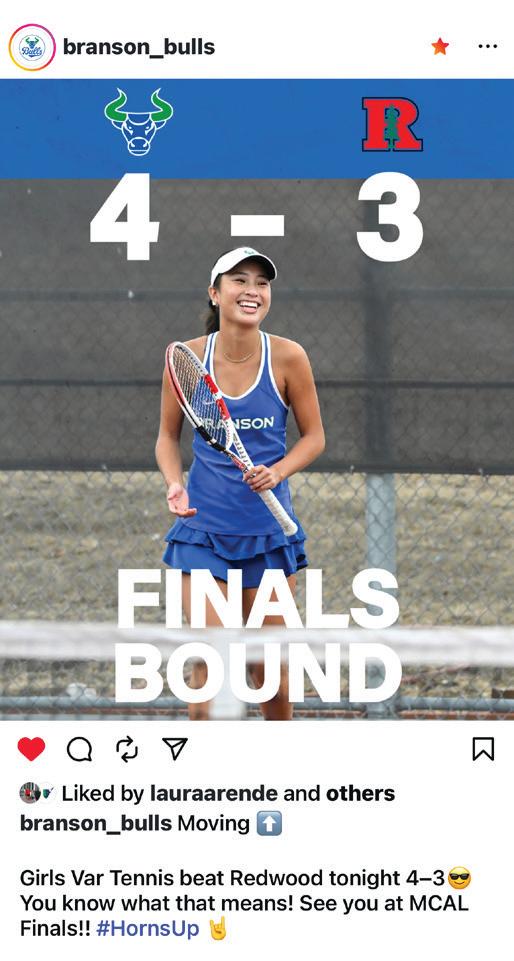 The Branson tennis team faced one of the strongest fields in many years, as Tam, San Marin, Marin Catholic, and Redwood all featured new and highly ranked players, shaking up the usual 1-2 finish of Redwood and Branson. Nonetheless, the Bulls celebrated their first MCAL Playoff victory over Redwood since 2021 with an upset win. In the finals, Branson lost to the resurgent and undefeated team from Tam, and the Bulls finished runner-up for the fourth year in a row. In the NCS playoffs, Branson was moved up into the D1 division where they ran into a powerful Dublin team, dashing hopes of another NCS title run by the Bulls.