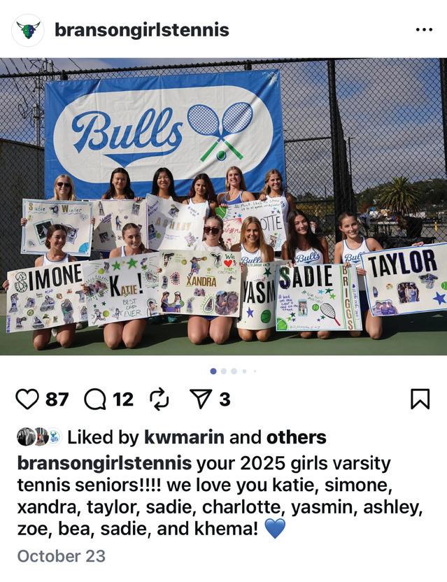 The Branson Varsity Girls Tennis team wrapped up their fall season on November 11th with a loss to Dublin High School in the first round of NCS Finals. In a match filled with dramatic tiebreakers and momentum swings, the Bulls came up just short, falling 3–4 on the road in Dublin, CA. Branson’s doubles teams once again provided the highlights of the day. Anna Jacobs/Kaylee Jiang (Doubles #3) delivered a commanding 6–1, 6–0 victory, continuing their dominant run. Noa Schachter/Talia Schneiter (Doubles #2) battled through three sets to earn a hard-fought win, taking the match in a decisive third-set tiebreaker. At Doubles #1, Yang/Xandra rallied after dropping the first set 1–6 to win the second 7–5, but ultimately fell in the third-set breaker in one of the day’s most exciting matches. In singles, Olivia Shekou (Singles #4) fought through two tight sets and emerged victorious after clinching her match in a gritty third-set tiebreaker. Despite strong effort, Katie Warrin (Singles #1), Paloma Vano-Rice (Singles #2), and Simone Schachter (Singles #3) were unable to overcome Dublin’s experienced top lineup.