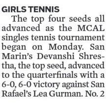 Our #1 singles player, Katie Warrin finished the season at 8-11, winning 4 of her last 7 matches and picking up the deciding win against Redwood in the MCAL finals. At #2 singles, Paloma Vano-Rice had a fantastic season, notching 10 wins versus 7 losses. Simone Schachter, at #3 singles, finished the season at 5-9 after some hard-fought matches. Olivia Shekou delivered many key wins at #4 singles and finished with a strong 5-3 record.