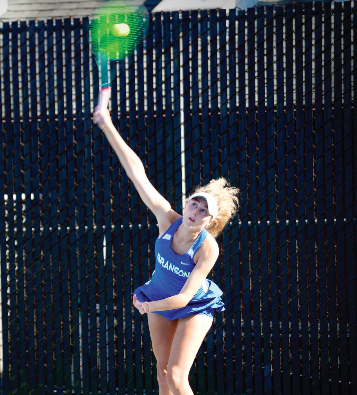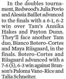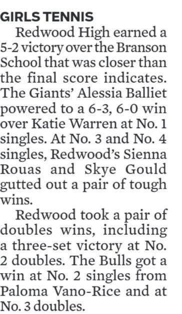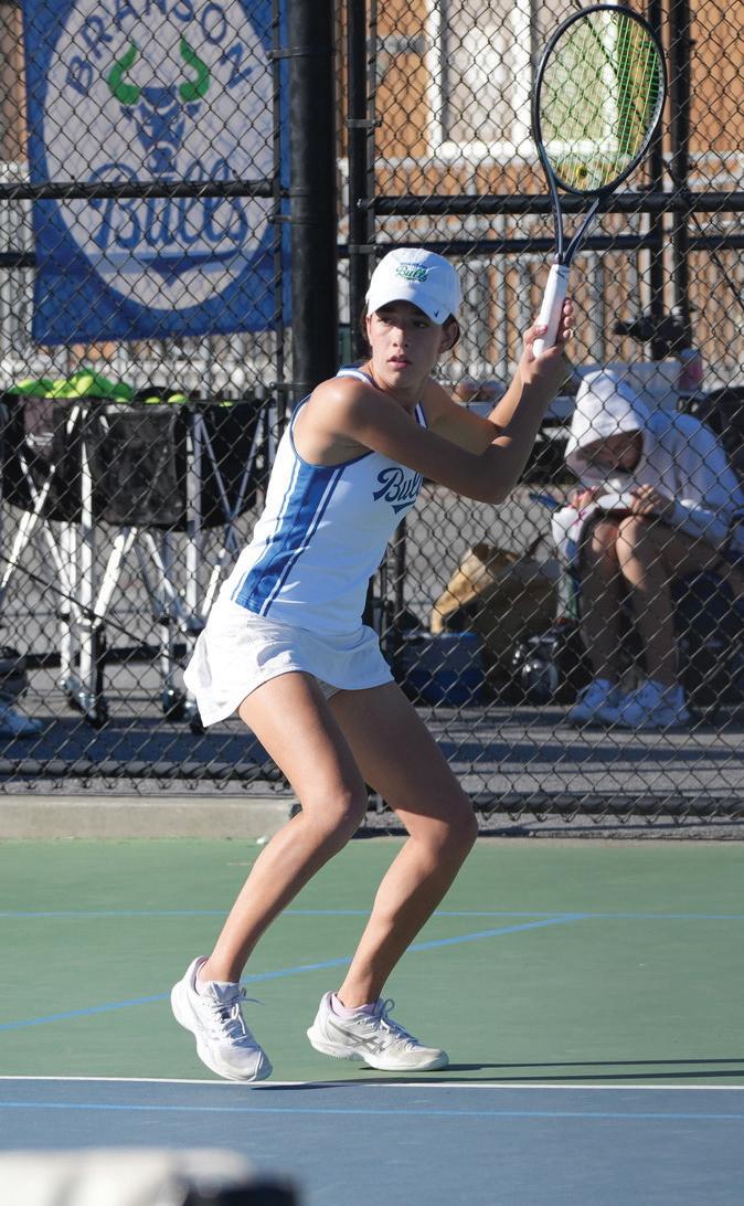 Branson’s lone team point came from doubles play. Bailey Hedrick/Anya Sridharan played well at #3, but lost 6-2, 6-3. At Doubles #2, Simone Schachter/ Xandra Sebastiani played a close first set but lost 6–4, 6–1. The top duo of Paloma Vano-Rice/Talia Schneiter earned a solid 6–4, 6–2 victory.