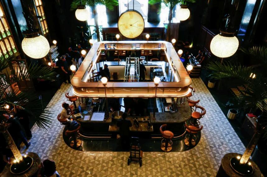 The glamorous, 120-seat dining room, redesigned by New York design firm AvroKO, preserves the hotel’s Art Deco grandeur while introducing contemporary touches custom marble floors, green velvet booths, walnut millwork, and potted palms all anchored by a central wraparound bar
