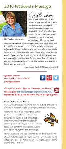 Cover Artist Andrea E. Winton Andrea E. Winton is an award-winning artist and illustrator. She moved to Camino in 2013 from Mariposa. She is originally from the Salinas Valley. Her artwork, rich in detail, color, or black & white graphics has adorned homes and businesses throughout the US and abroad. Her distinctive, sometimes whimsical, style of illustration and cartooning can also be enjoyed in various children’s books, adult & children’s coloring books, custom signs, blackboard art, t-shirt and apron designs. Andrea’s illustrations have been chosen for the past three years for the official t-shirt of the Apple Hill Harvest Run held every November for the last 36 years. To contact Andrea you can call 530 644-2781 or email her at aewinton5215@att.net.