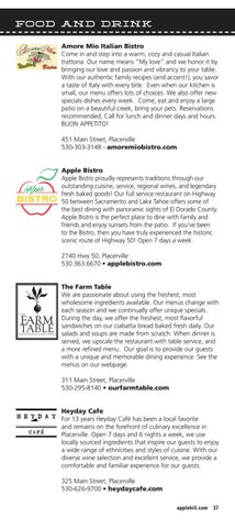 Amore Mio Italian Bistro Come in and step into a warm, cozy and casual Italian trattoria. Our name means “My love” and we honor it by bringing our love and passion and vibrancy to your table. With our authentic family recipes (and accent!), you savor a taste of Italy with every bite. Even when our kitchen is small, our menu offers lots of choices. We also offer new specials dishes every week. Come, eat and enjoy a large patio on a beautiful creek, bring your pets. Reservations recommended, Call for lunch and dinner days and hours. BUON APPETITO! 451 Main Street, Placerville 530-303-3148 - amoremiobistro.com Apple Bistro Apple Bistro proudly represents traditions through our outstanding cuisine, service, regional wines, and legendary fresh baked goods! Our full service restaurant on Highway 50 between Sacramento and Lake Tahoe offers some of the best dining with panoramic sights of El Dorado County. Apple Bistro is the perfect place to dine with family and friends and enjoy sunsets from the patio. If you’ve been to the Bistro, then you have truly experienced the historic scenic route of Highway 50! Open 7 days a week. 2740 Hwy 50, Placerville 530.363.6670 • applebistro.com The Farm Table We are passionate about using the freshest, most wholesome ingredients available. Our menus change with each season and we continually offer unique specials. During the day, we offer the freshest, most flavorful sandwiches on our ciabatta bread baked fresh daily. Our salads and soups are made from scratch. When dinner is served, we upscale the restaurant with table service, and a more refined menu. Our goal is to provide our guests with a unique and memorable dining experience. See the menus on our webpage. 311 Main Street, Placerville 530-295-8140 • ourfarmtable.com Heyday Cafe For 13 years Heyday Café has been a local favorite and remains on the forefront of culinary excellence in Placerville. Open 7 days and 6 nights a week, we use locally sourced ingredients that inspire our guests to enjoy a wide range of ethnicities and styles of cuisine. With our diverse wine selection and excellent service, we provide a comfortable and familiar experience for our guests. 325 Main Street, Placerville 530-626-9700 • heydaycafe.com applehill.com