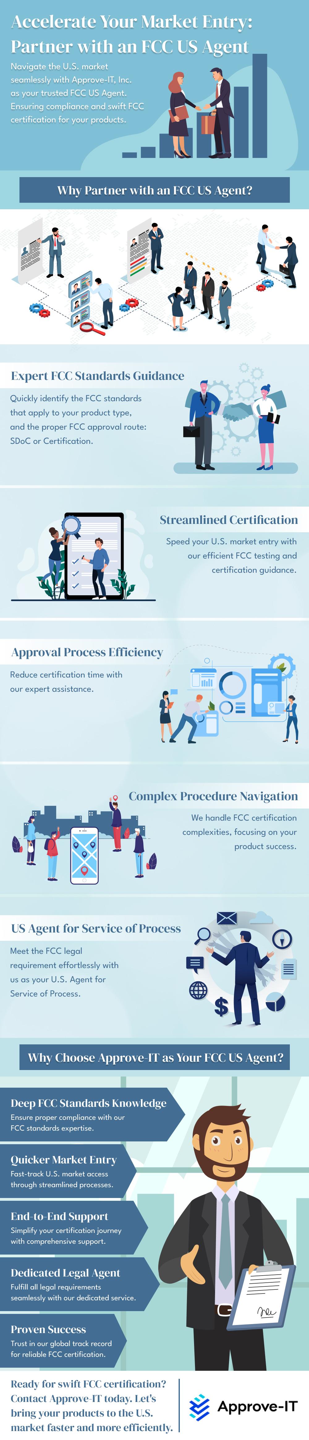 https://approve-it.net/regional-approval/usa-fcc-certification/: Accelerate your market entry into the U.S. with Approve-IT, Inc. as your trusted FCC U.S. agent. We offer expert guidance on FCC standards, streamline certification processes, ensure efficiency in approval procedures, navigate complex FCC requirements, and act as your US Agent for the Service of the Process. With deep FCC knowledge, quick market entry, end-to-end support, dedicated legal assistance, and a proven track record, Approve-IT simplifies FCC certification for your products. Contact us today to fast-track your U.S. market access and bring your products to market swiftly and efficiently.
