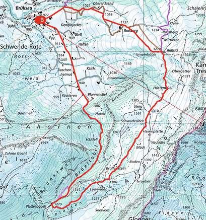 Von der Kirche Brülisau geht es zum Warmlaufen flach durch das Gebiet «Pfannenstiel». Nun steigt der Winterwanderweg kräftig an und im schattigen Brüeltobel wandern Sie hinauf zum Berggasthaus Plattenbödeli. Ungefähr auf halber Strecke passieren Sie das sogenannte «Häxewäldli», ein Wäldchen mit Zwergtännchen. Nach einer Stärkung geht es durch ein Waldstück in das weite Alpgebiet Soll mit Alphütten in Winterschlaf. Nach dem Bildstöckli erreichen Sie das aussichtsreiche Berggasthaus Ruhesitz. Von dort wandern Sie mit maximaler Alpsteinsicht hinunter zum Ausgangspunkt nach Brülisau.