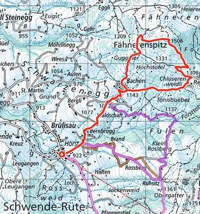 Die empfohlene Marschrichtung einschlagen. Beim Berggasthaus Ruhesitz können Schlitten gemietet werden für eine Schussfahrt hinunter nach Brülisau und wer sich für den Abstieg zu Fuss entscheidet, wird mit viel Nachmittagssonne belohnt.