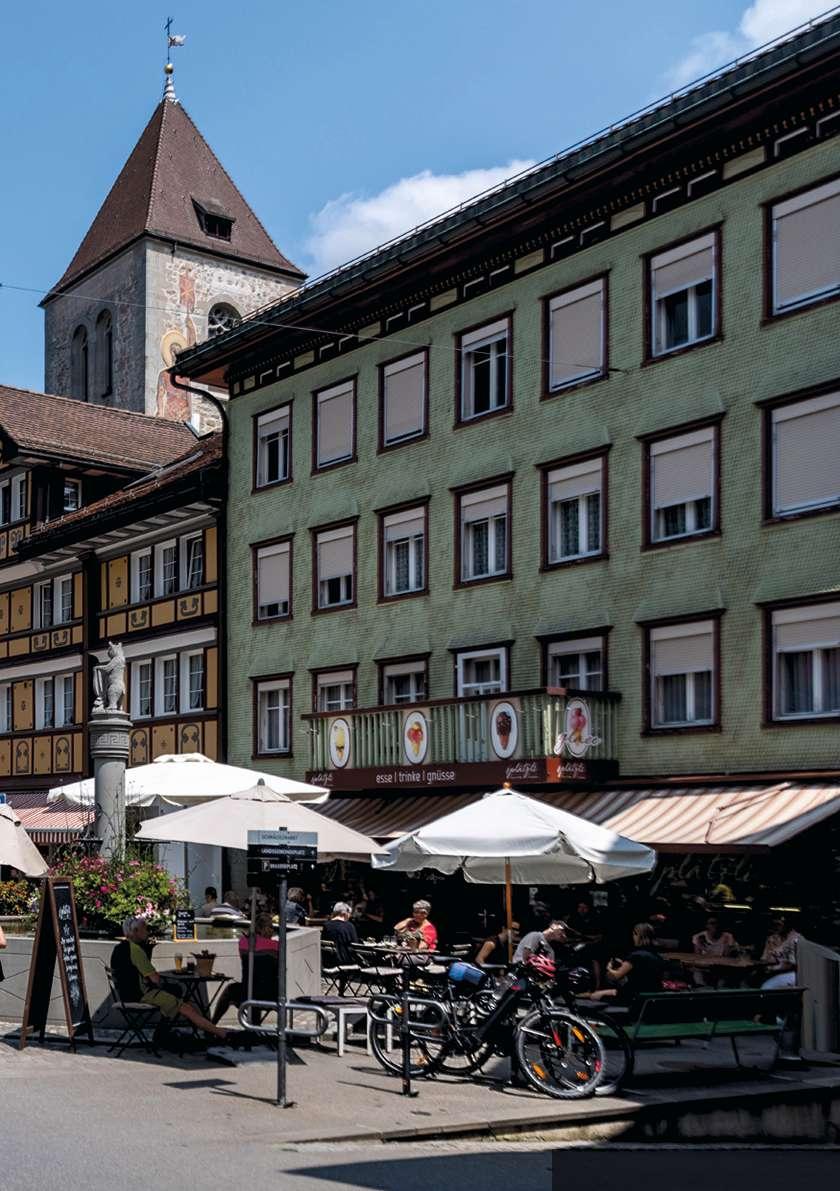 Eine besondere Augenweide sind die «Tafeen», vorwiegend im Dorfzentrum anzutreffen. Ein «Tafeen», abgeleitet vom lateinischen Wort taverna, ist ein Aushängeschild nicht nur für Gasthäuser. Die LÖWEN-DROGERIE (3) an der Hauptgasse gilt mit ihrer reich verzierten Fassadenbemalung als Bijou. Johannes Hugentobler malte Heilkräuter auf die rundbogig gerahmten Kästen der Aufzugsläden und stellte damit den Bezug seiner Malerei zur Drogerie her. Die Hauptgasse mit ihren schmucken, farbenfrohen Häusern ist immer ein einzigartiger Anziehungspunkt für unsere Gäste.
