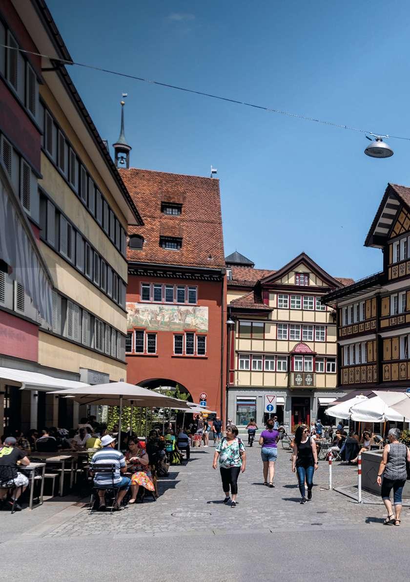 Besonders augenfällig ist das HAUS KONKORDIA (10) an der Engelgasse, ein Patrizierhaus aus dem 17. Jahrhundert mit steilem Giebeldach. Eine reiche ornamental dekorierte Täferbemalung überzieht die ganze Südfassade. Auf der Hohlkehle der Dachuntersicht sind die acht Lebensalter dargestellt. Diese lebhafte, farblich dezente Bemalung geht auf August Schmid (1930) zurück.