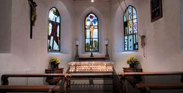 Die HEILIGKREUZKAPELLE (2) an der Hauptgasse wurde nach dem verheerenden Dorfbrand 1560 wieder aufgebaut. Die Glasfenster mit den fünf Geheimnissen des schmerzhaften Rosenkranzes schuf Ferdinand Gehr 1964.