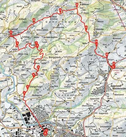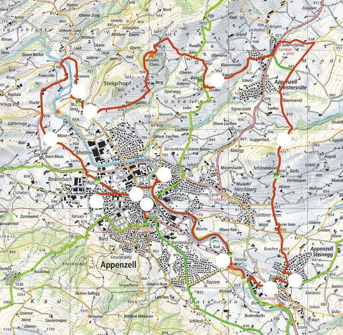 Ausgangspunkt des Rundwanderweges ist die Wallfahrtskirche «Maria Hilf» in Haslen. Nach dem Dorfplatz gehen Sie linker Hand auf einem Wiesenweg, vorbei an verschiedenen traditionellen Bauernhäusern. Am Waldrand bei der Liegenschaft Auen verzweigt sich der Weg und Sie steigen ab zum Zusammenfluss von Sitter und Rotbach, wo Sie zum idyllischen Badeplatz «Strom» im Grenzgebiet der Kantone Al und AR gelangen. Der Weg führt über den Rotbach und hangaufwärts vorbei an der Strafanstalt in Richtung Teufen. Nachdem das Kapuzinerinnenkloster Wonnenstein (eine Innerrhoder Exklave) passiert ist, wandern Sie geradeaus und steigen auf einem kreativ angelegten Eisentreppen-Pfad ab zum Höchfall. Dort stürzt das Wasser über eine mehr als 20m hohe Standsteinstufe in die Tiefe. Nach dem Rückweg die Stufen hinauf, unterqueren Sie zwei Mal die Autostrasse und steigen erneut ab zum Rotbach, um ihn diesmal zu überqueren. Auf der anderen Bachseite – wieder im Kanton AI – steigt der Weg an nach Hinterhaslen. Bei der zweiten Verzweigung biegen Sie links ab, überqueren die Hauptstrasse und folgen dieser, bis der Weg durch ein Waldstück zum wunderschönen Bildstöckli St. Wendelin führt. Haslen ist nun in Sichtweite und geradeaus erreichen Sie den Ausgangspunkt.
