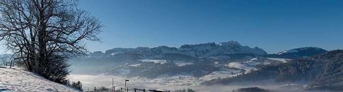 Stets flach führt der Weg nach den letzten Häusern des Quartiers über die offenen Felder der sogenannten Möser. Im Blick behält man den Alpstein, der sich aus schönster Perspektive und in seiner ganzen verschneiten Pracht zeigt. Parallel zu einer wenig befahrenen Strasse wendet sich der Blick gegen den Hügelzug des Hirschbergs mit seinen schönen, verstreuten Bauernhäusern. Zurück zum Ausgangspunkt geht es immer noch flach und sehr lieblich wieder gegen Eggerstanden zu. Romantisch ruhig liegen hier die Landschaft und das Dorf Eggerstanden. Das einzig wahrnehmbare Geräusch ist oftmals ein zügiger Wind, Schal nicht vergessen und zum Aufwärmen nach dem Spaziergang empfehlen wir eine Einkehr in einem der beiden Gasthäuser.