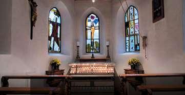 The HEILIGKREUZKAPELLE (9) (Holy Cross Chapel) on the Hauptgasse (main street) was rebuilt after the village was devastated by fire in 1560. The stained glass windows depicting the five sorrowful mysteries of the rosary were designed by Ferdinand Gehr in 1964.