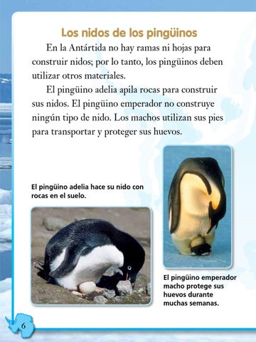 Los nidos de los pingüinos En la Antártida no hay ramas ni hojas para construir nidos; por lo tanto, los pingüinos deben utilizar otros materiales. El pingüino adelia apila rocas para construir sus nidos. El pingüino emperador no construye ningún tipo de nido. Los machos utilizan sus pies para transportar y proteger sus huevos.