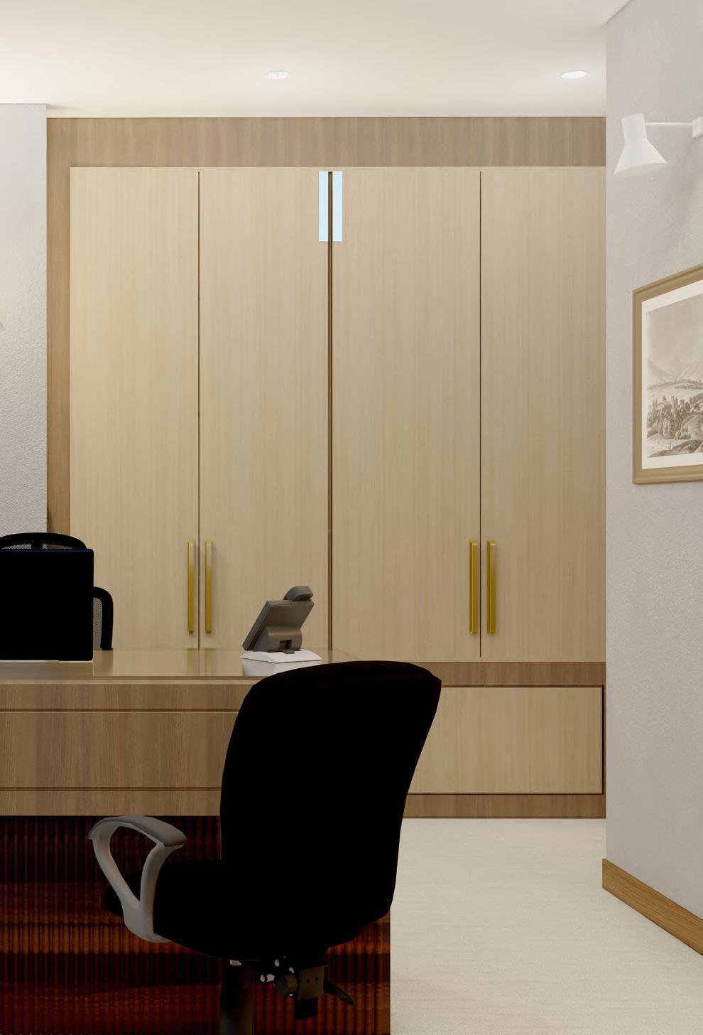 The reconfiguration of wall partitions into functional cabinetry for displays and document storage introduces a deliberate geometric articulation, seamlessly integrating into the spatial composition as both a practical element and an inherent design feature.